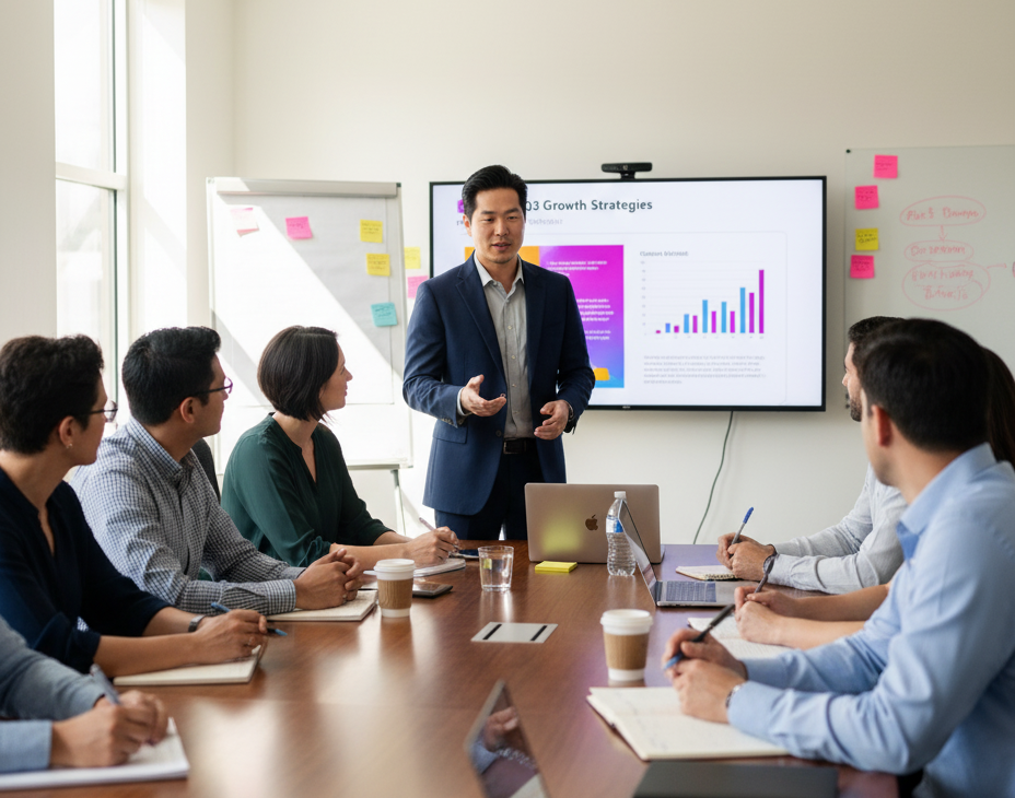 A man in a navy blazer presenting to a group of colleagues in a conference room with charts on a screen and whiteboards.